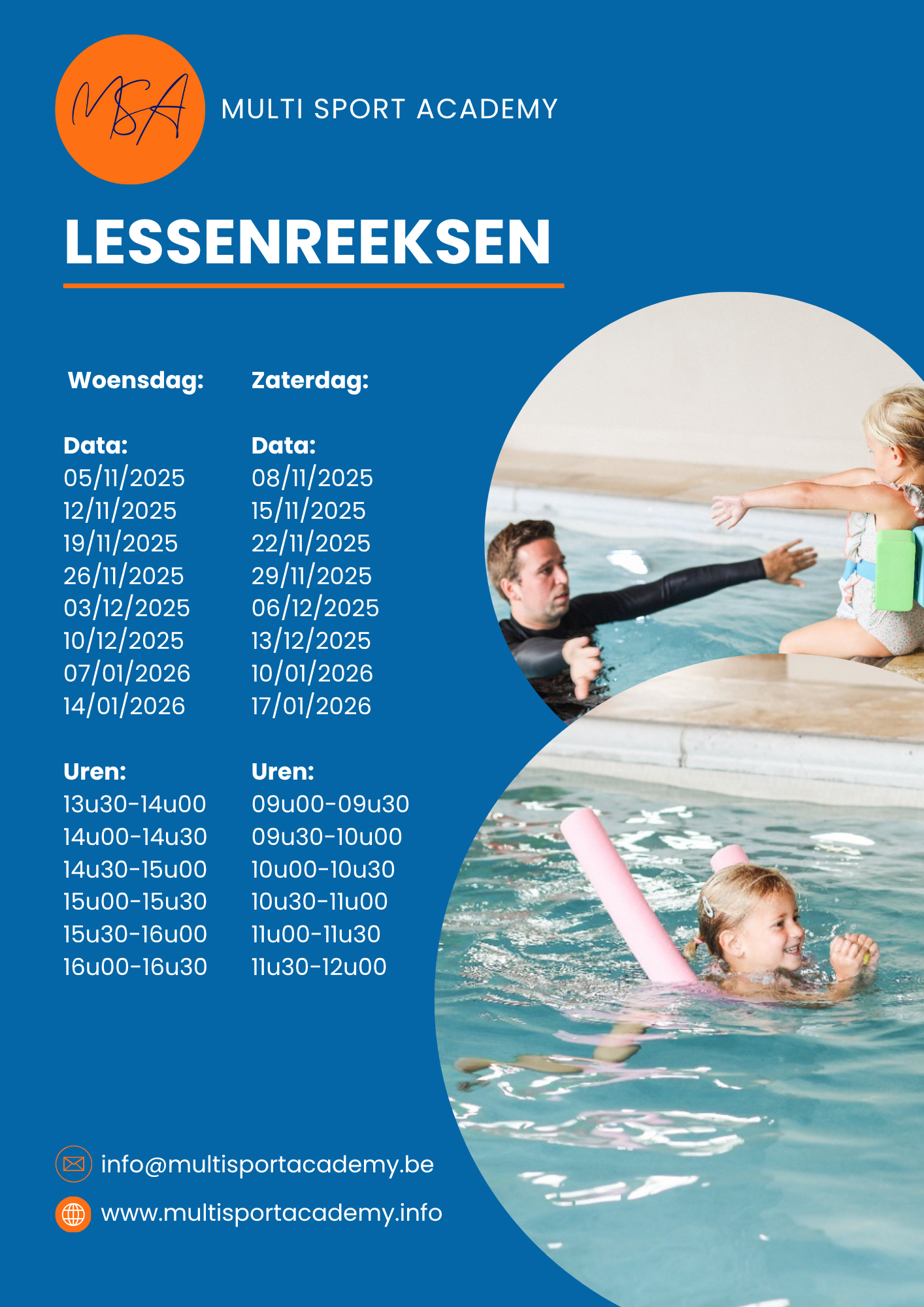 Onze lessenreeksen bestaan uit 8 sessies van telkens 30 minuten. Zwemmen is intensief en vraagt heel wat kracht en coördinatie, daarom starten we pas vanaf 5 jaar. Op die leeftijd hebben de meeste kinderen voldoende kracht om de juiste techniek aan te leren.